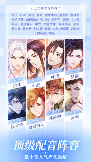 2、我们的声优阵容也很华丽,有幸邀请了张杰、吴磊、叶清、皇贞季、宝木中阳、藤新、图特哈蒙等知名国内配音艺术家演绎性格各异的男性角色;