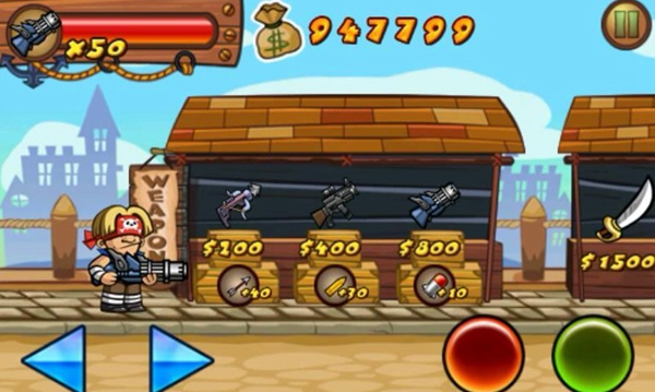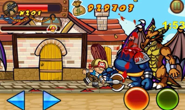 在游戏里面你将要扮演一个能够拯救世界的孤胆英雄杰克。游戏的操作非常简单,屏幕左侧下方的两个箭头控制人物的左右移动,右侧的两个按钮控制攻击(红色为近程攻击,绿色为远程攻击)。