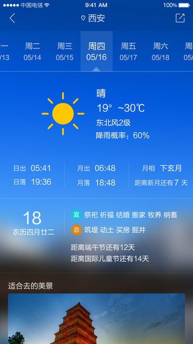 2、操作方便:上下滑动的操作方式,可更快速更便捷的查看天气趋势、风速、生活指数等信息;