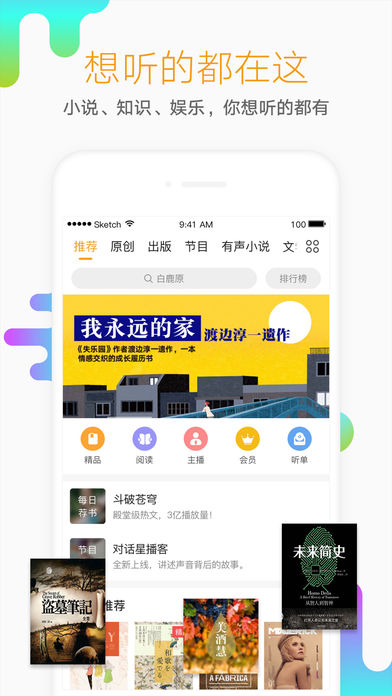懒人听书支持多种客户端平台,产品目前由有声书城、听吧社区、开放平台三部分组成。