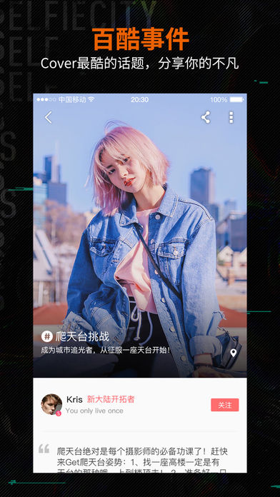 告别传统自拍审美,质感滤镜、百变视频、风格作品塑造你的自拍态度,一起狩猎城市里好拍的地点、好酷的事件,做城市的潮流猎人;