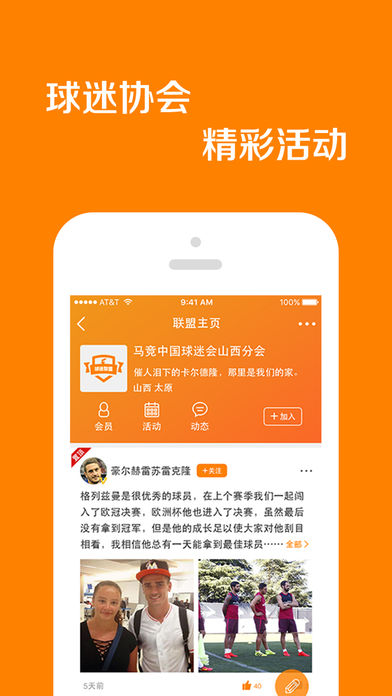 注册时添加球迷属性,推荐相关球迷联盟,加入联盟认识志趣相近的朋友,参与看球、踢球活动。