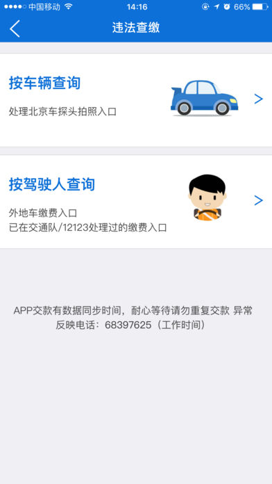 3、违法查缴:通过车辆信息和驾驶人信息,可查在北京辖区内的交通违法记录。京牌车辆车主本人可完成在线缴罚款和驾驶证扣分。