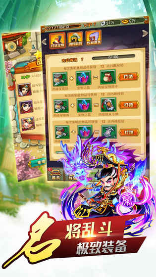拒绝爆款,只要独一无二!三千名将,只服一人!征服他们,你就是名将的唯一主人。游戏提供了曹操、关羽以及赵云等近千名武将,每一位都是取自真实的三国历史,玩家都可以招降三国历史名将到自己麾下,与他们一同驰骋沙场。潜力分配,装备搭配,玩家可以根据自己的喜好培养出符合自己心意的将领。