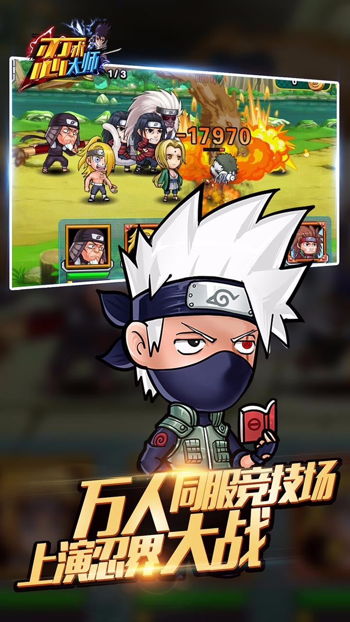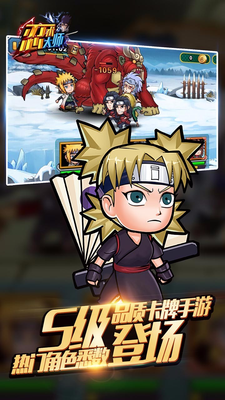 忍术大师为您号召火影忍者各村落忍者集结,每次可以上阵五名忍者伙伴,打倒小兵获取查克拉,通灵兽召唤,奥义技能送给BOSS,忍术大师手游经典策略卡牌战,再现忍界圣战。