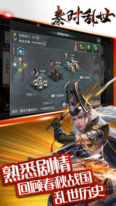 3、春秋战国时代,各方势力纵横捭阖。城主之间,亦敌亦友,欲在这乱世中脱颖而出,不仅考验你排兵布阵的能力,更考验你总揽大局的智慧。合理发展城池建设,勇敢统帅武将部队,将自己的策略发挥到极致,必能在这纷争不断的乱世,君临天下。
