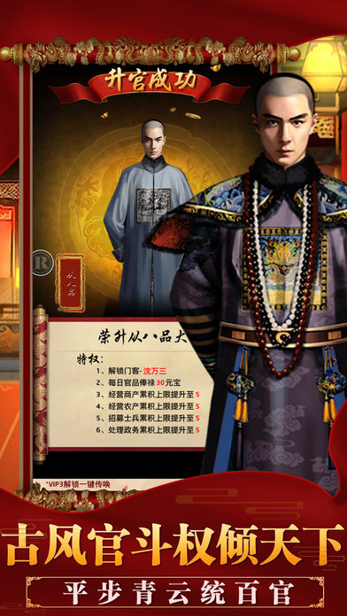 官居一品是讲述了一个官场小白白一点点通过谋划和计策,从九品芝麻官做上大官的故事!游戏中玩家将会穿越到清朝官场,体验一把当官的感觉!游戏操作简单,剧情丰满有趣,快来试试吧!