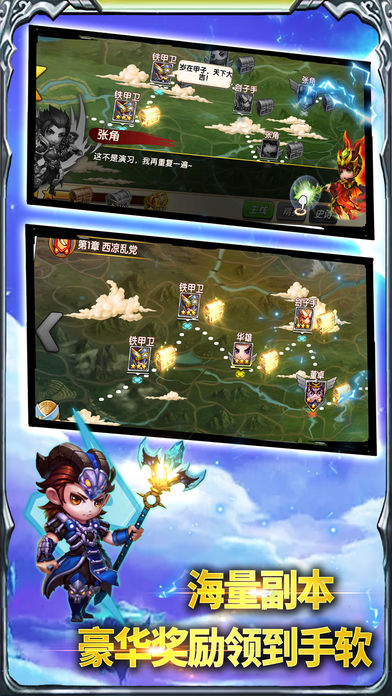 1、三国英雄,势如破竹。升级、突破、神装、天命、超神等多种培养要素,炼制你的专属得力英雄阵容,助你逐鹿天下。